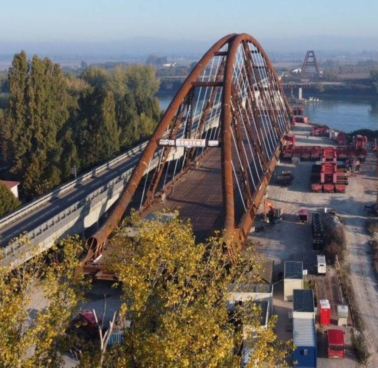 A buon punto la fase di montaggio dei due impalcati in acciaio corten, ben visibili nei cantieri Toto Costruzioni Generali sulle due rive opposte del Po dei comuni di San Benedetto Po e Bagnolo San Vito. Effettuato il sollevamento del primo impalcato del nuovo ponte a quota di varo - un progetto della Provincia di Mantova con il cofinanziamento della Regione Lombardia - propedeutico al varo vero e proprio, per mezzo di speciali torri oleodinamiche fornite dalla Fagioli S.p.A, leader mondiale nell’ingegneria delle grandi movimentazioni. La Toto Costruzioni Generali ha individuato in Fagioli spa il partner industriale per rendere attuabile un progetto esecutivo della stessa TCG che contemplava questo tipo di movimentazioni.